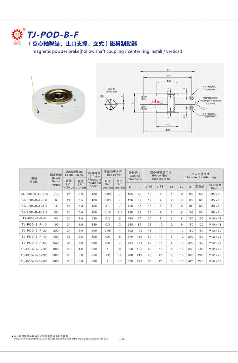 東莞天機傳動廠家生產(chǎn)的空心軸磁粉剎車器又稱立式磁粉剎車器是磁粉制動器中的一種。空心軸磁粉剎車器價格分為:TJ-POD-B-F、TJ-POD-B、TJ-POD-A、TJ-POD-B-E。這幾種型號的磁粉剎車器都為空心軸連接,立式止口支撐,使用的DC24V安全電壓。