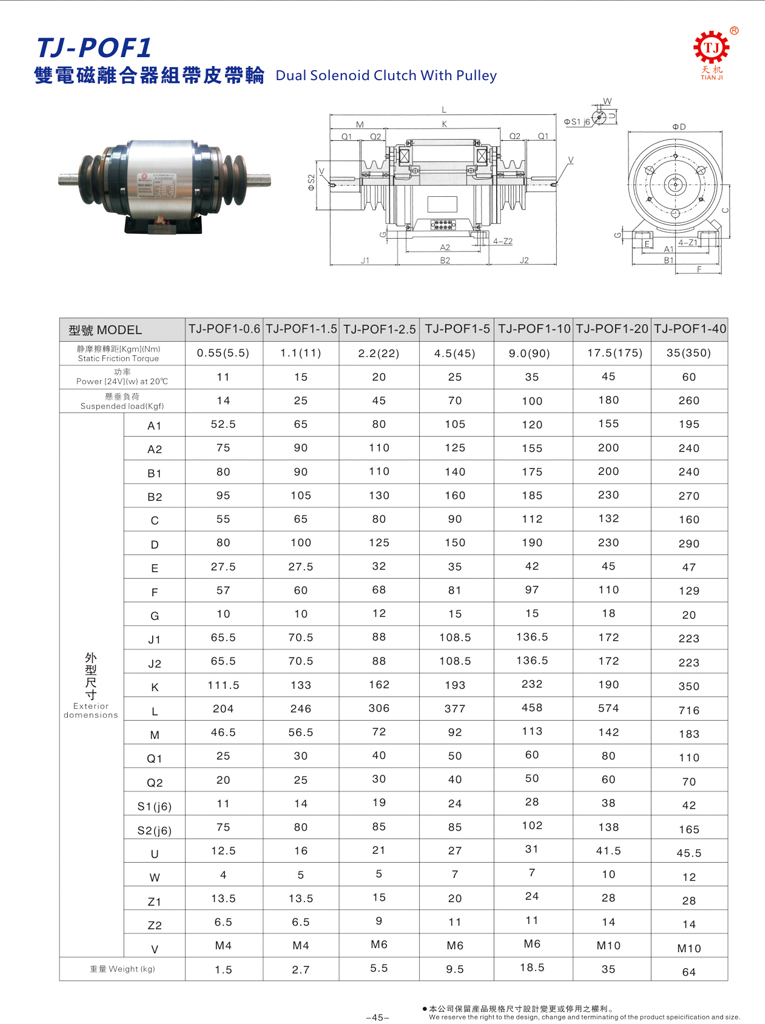 以下是雙電磁離合器帶皮帶輪,雙電磁離合器POF1型選型參數(shù)圖