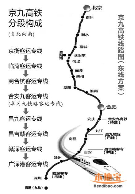 京九高鐵又稱京九客運專線,線路全長2000公里,設計時速為350公里,北起北京,跨越京、冀、魯、豫、皖、贛、粵七個省級行政區(qū),南至深圳,連接香港九龍,是連接環(huán)渤海和珠三角的重要高速鐵路干線。途徑北京、霸州、任丘、河間、衡水、清河(邢臺)、臨清、聊城、臺前(濮陽)、梁山(濟寧)、菏澤、商丘、亳州、阜陽、淮南、合肥、安慶、九江、南昌、吉安、贛州、河源、惠州、深圳,最后到達香港九龍。主要由北京至衡水客專(京霸段預計2019年建成)、臨菏客專(臨清—菏澤)、商合杭高鐵(商丘到合肥段已經建設)、合安九客運專線(阜陽到九江段),昌九客運專線(九江—南昌)、昌贛客運專線(南昌—贛州)和贛深客運專線(贛州—深圳)和廣深港客運專線(深圳—九龍)接駁而成。京九高鐵商丘以南段將先期建成通車,待北京到商丘段的規(guī)劃建設完成,京九高鐵將逐步形成。本專題將為您介紹2015京九高鐵最新消息和京九高鐵通車時間,幫助您了解最新資訊,方便你的出行。